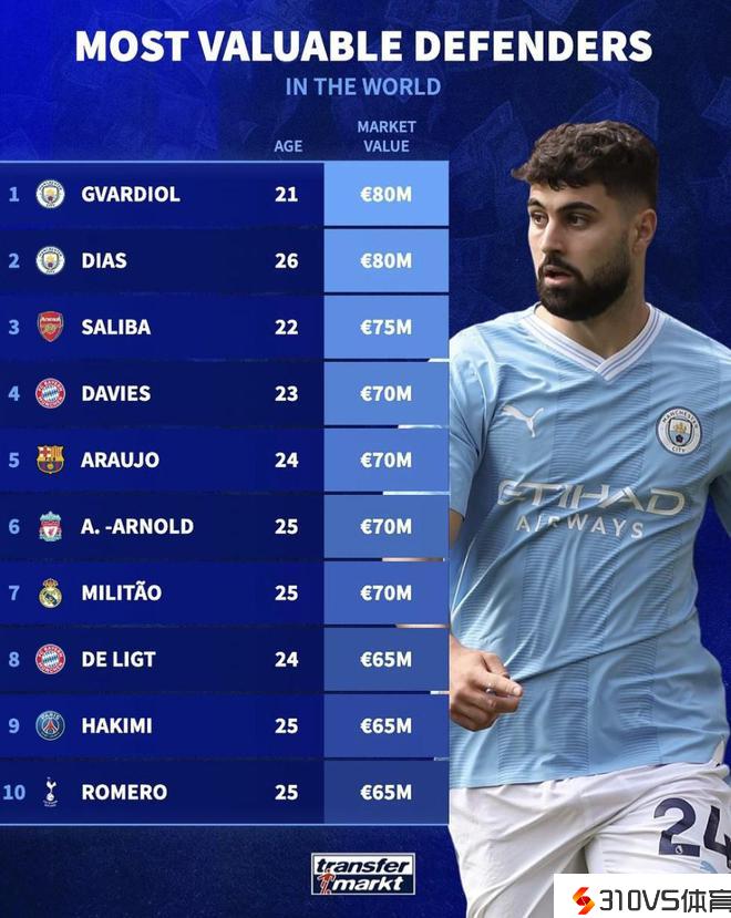 德转后卫身价榜:格瓦迪奥尔、鲁本-迪亚斯8000万欧并列居首