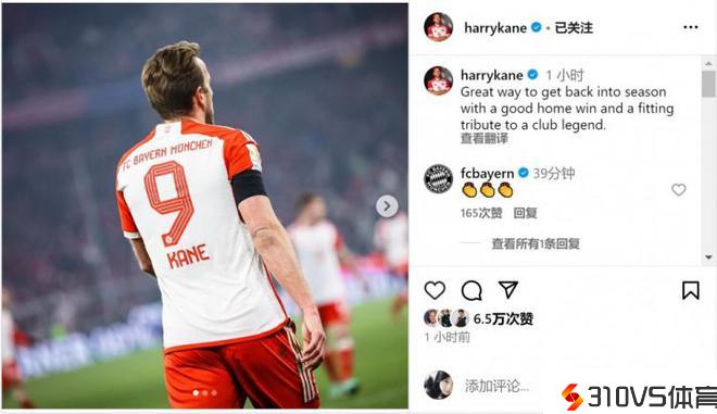 凯恩社媒:我们以主场成功重返赛季,并向俱乐部传奇致敬