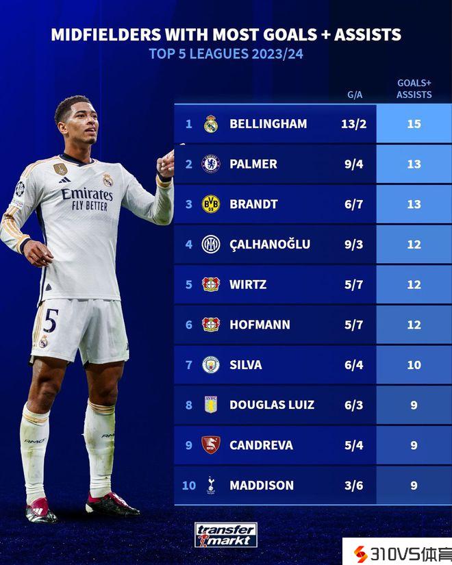 本赛季五大联赛中场制造进球排行榜:贝林厄姆13球2助领跑