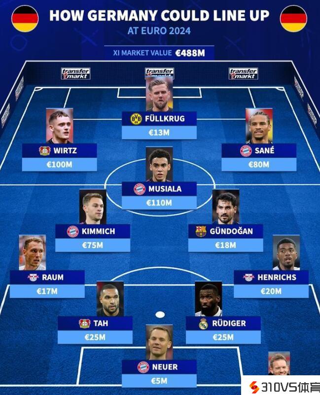 实力如何?德转预测德国队欧洲杯首发:穆西亚拉和维尔茨伙伴