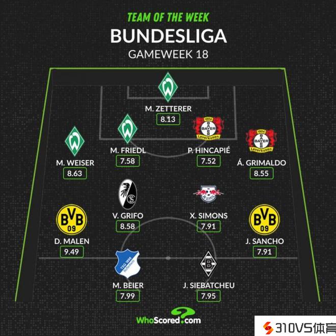 WhoScored评德甲第十八周最佳阵容:桑乔中选,无拜仁球员