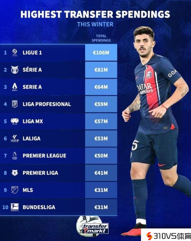 德转列冬窗各联赛支出榜:法甲超1亿欧居首,英超5000万欧第7