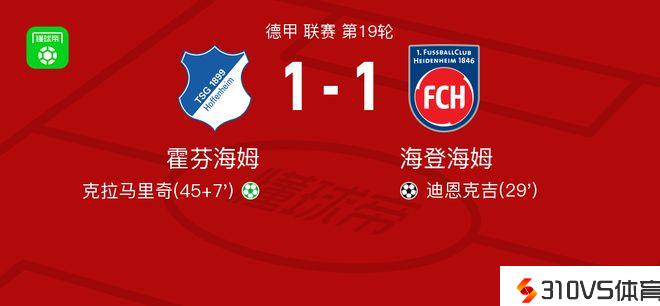 北京时间1月27日德甲 联赛 第19轮,霍芬海姆主场对阵海登海姆。霍芬海姆克拉马里奇破门。海登海姆迪恩克吉破门。最终比分1-1。