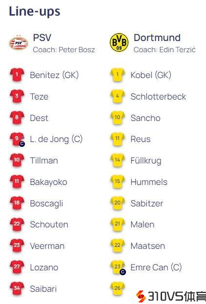 PSV埃因霍温首发:27-洛萨诺、9-吕克-德容、11-巴卡约科、23-费尔曼、22-斯豪滕、34-萨伊瓦里、8-德斯特、10-蒂尔曼、18-博斯卡利、3-特泽、1-贝尼特斯