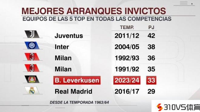 ESPN列出了五大联赛球队赛季残局各赛事不败场次排名,2011-2012赛季尤文42场不败居首,本赛季勒沃库森33场不败排名第五位。