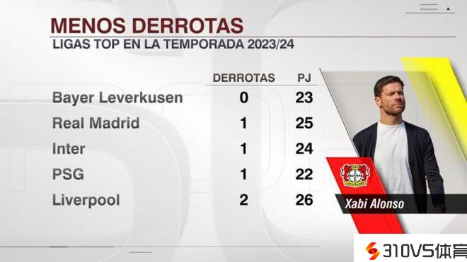 本赛季五大联赛失利最少榜:药厂不败居首,皇马国米巴黎输1场
