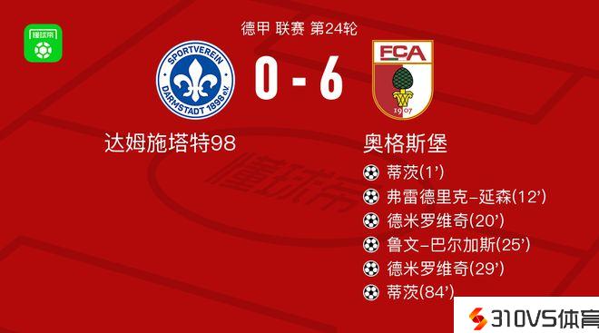 北京时间3月2日德甲 联赛 第24轮,达姆施塔特98主场对阵奥格斯堡。达姆施塔特98。奥格斯堡蒂茨梅开二度,弗雷德里克-延森破门,德米罗维奇梅开二度,鲁文-巴尔加斯破门。最终比分0-6。