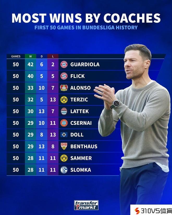 阿隆索执教德甲前50场33胜,历史上仅次于瓜帅和弗里克