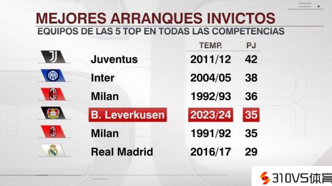 赛季残局不败场次榜:尤文42场居首,药厂35场追平91-92米兰