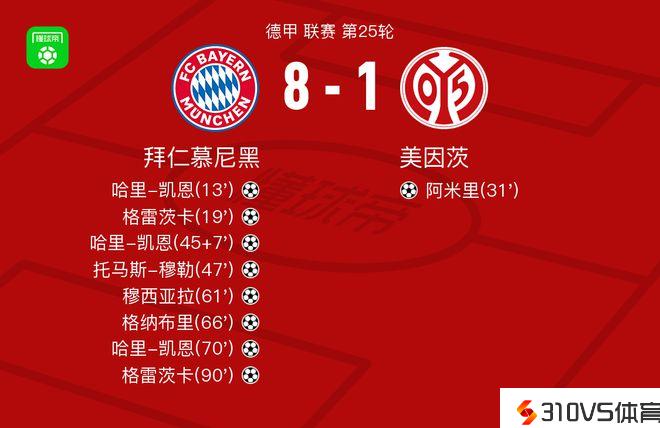 第71分钟,凯恩头球补射破门戴帽,拜仁7-1!