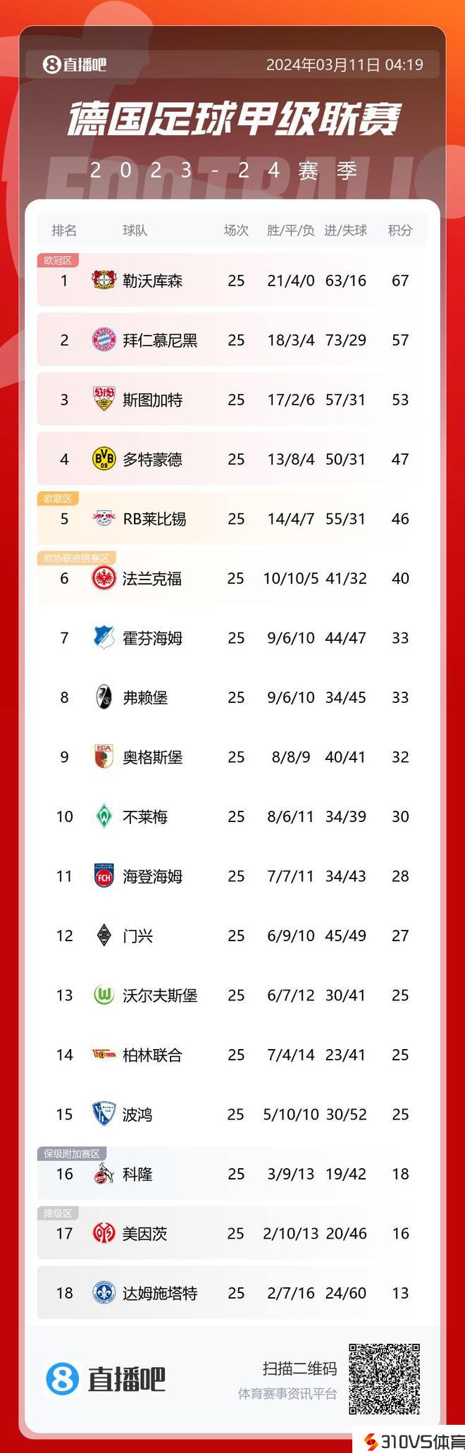 德甲积分榜:勒沃库森25轮不败,剩9轮抢先第二拜仁10分