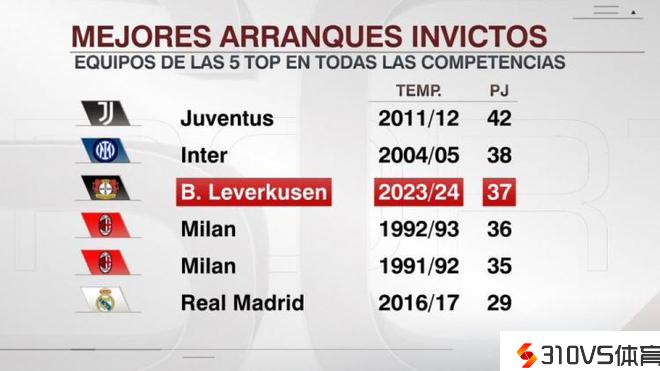 五大联赛球队赛季残局不败榜:11-12尤文42场居首,药厂37场第3