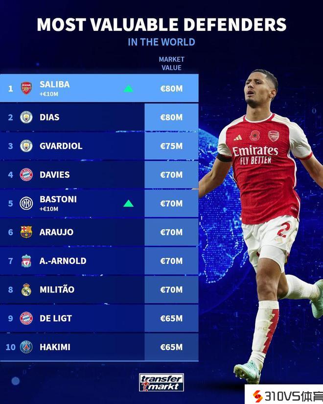 足坛后卫身价排行:萨利巴、鲁本-迪亚斯8000万欧并列第一