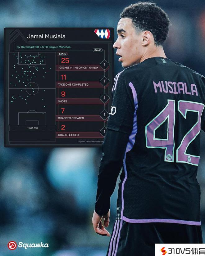 穆西亚拉对达姆施塔特禁区内触球25次,发明五大联赛近8年岁录