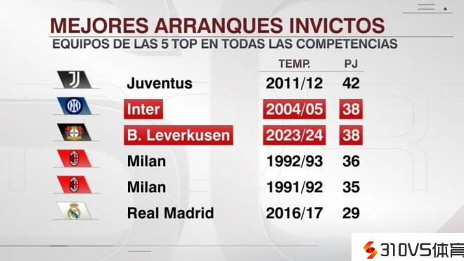勒沃库森赛季残局38场不败追平04-05国米,距离尤文纪录差4场