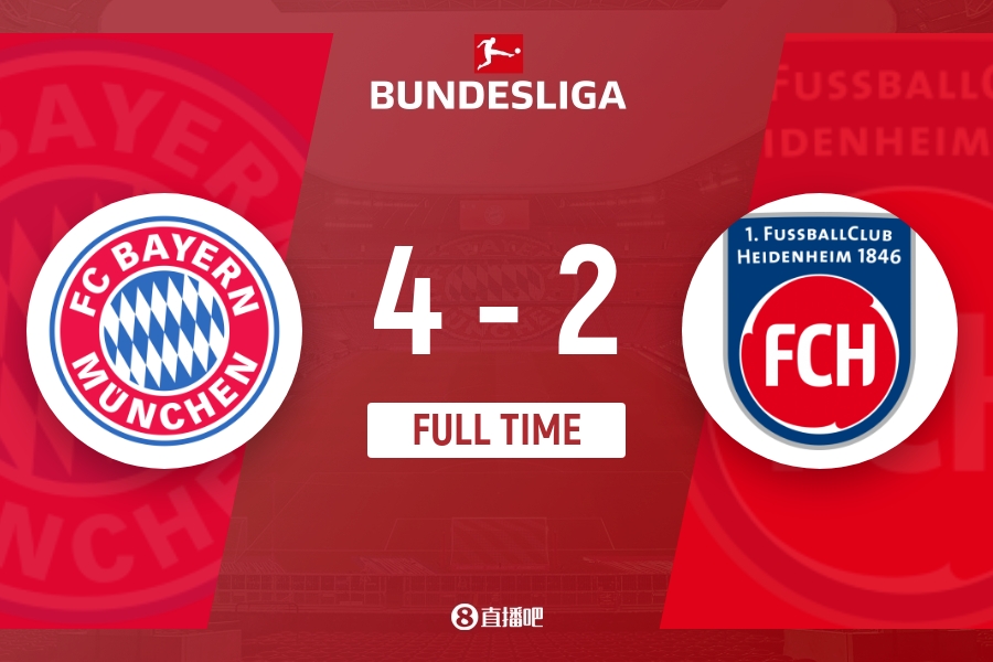 下半场伤停补时5分钟,全场比赛结束,最终拜仁4-2海登海姆。