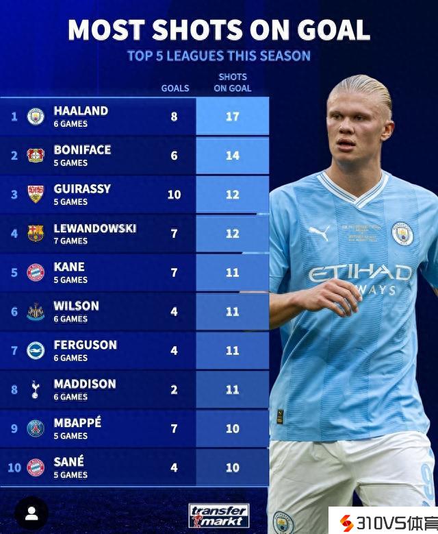 五大联赛射正次数榜:哈兰德17次居首,莱万,凯恩,姆巴佩在列