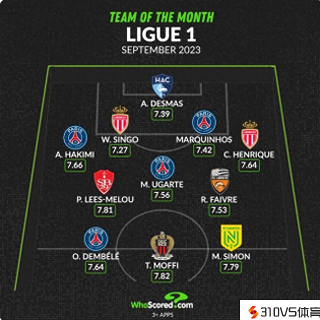 WhoScored法甲9月最佳阵:巴黎4将中选,登贝莱、阿什拉夫在列