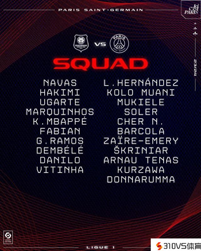 巴黎vs雷恩大名单:姆巴佩领衔,G-拉莫斯、登贝莱在列