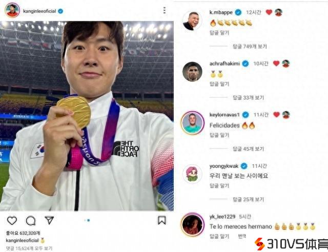 韩媒:李刚仁社媒庆贺取得亚运会金牌,姆巴佩第一个向他表示祝贺