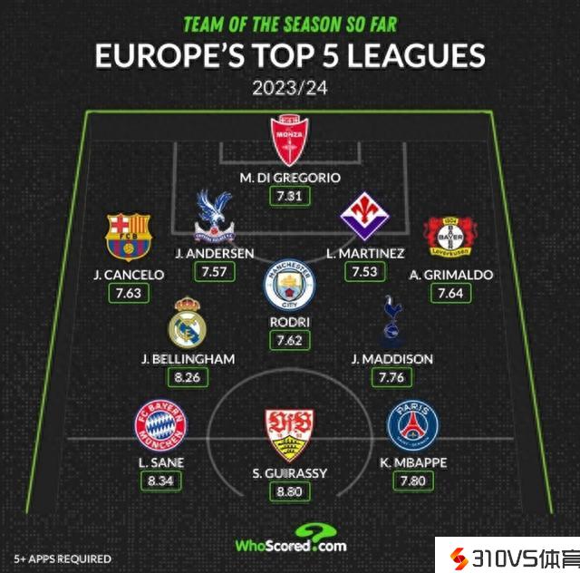 Whoscored评本赛季五大联赛最佳阵:贝林厄姆领衔,姆巴佩在列