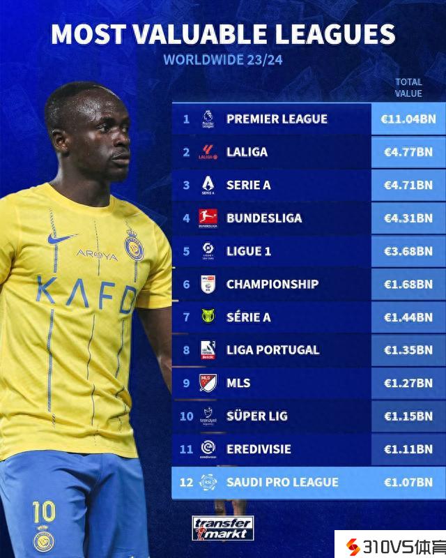 全球联赛身价排行:英超断崖领跑,美职联第9,沙特联第12