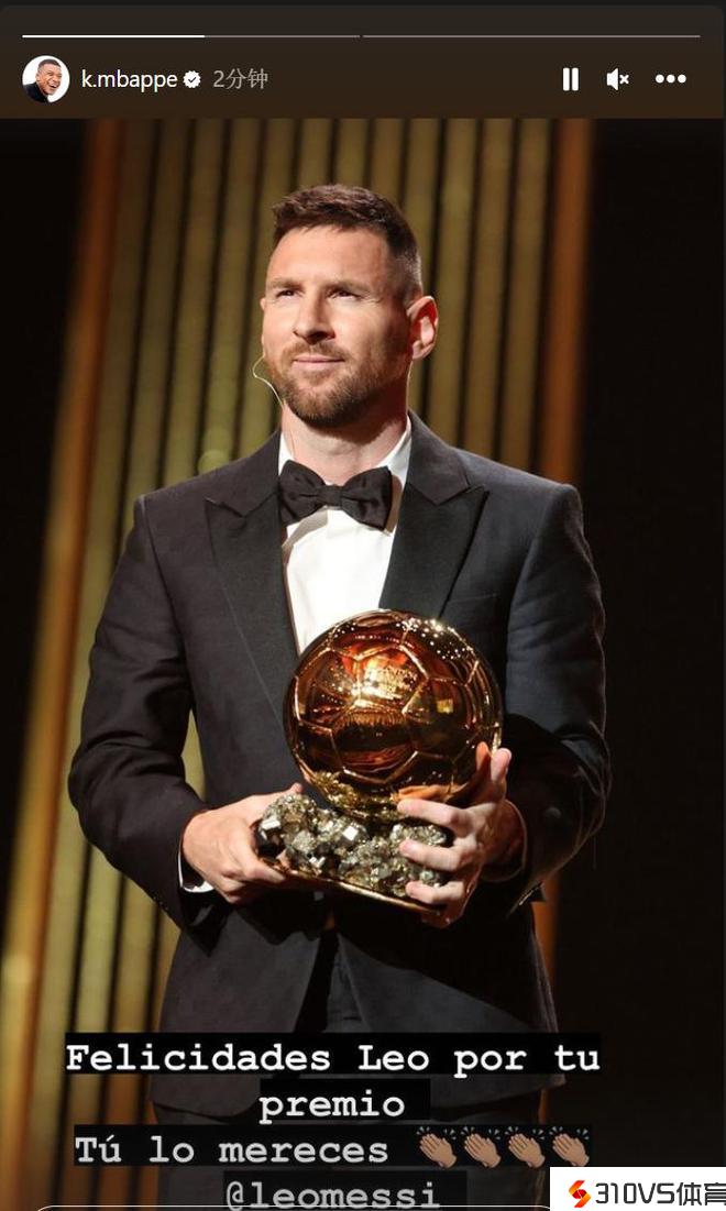 姆巴佩社媒送祝贺:祝贺梅西第八座金球奖!你应得的!