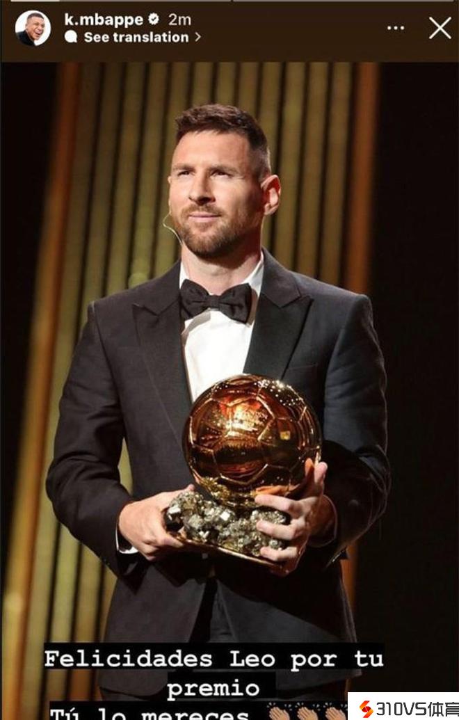 2023年金球奖揭晓后几分钟,姆巴佩发文祝贺他的前队友、2022年世界杯的主要对手莱昂内尔·梅西赢得了他的第八个金球奖。