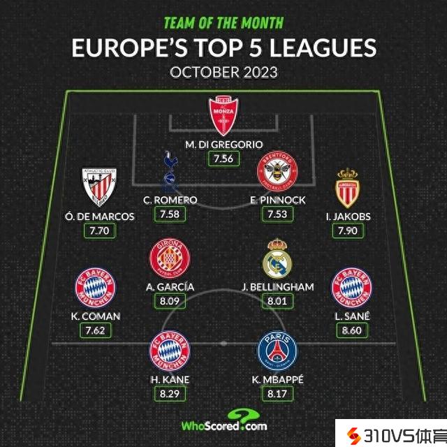 WhoScored五大联赛10月最佳阵:凯恩、姆巴佩领衔,贝林厄姆在列