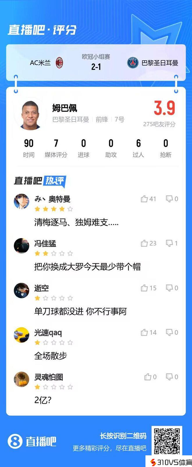 3.9分!吧友吐槽姆巴佩:全场散步、单刀没进、换大罗至少戴帽...
