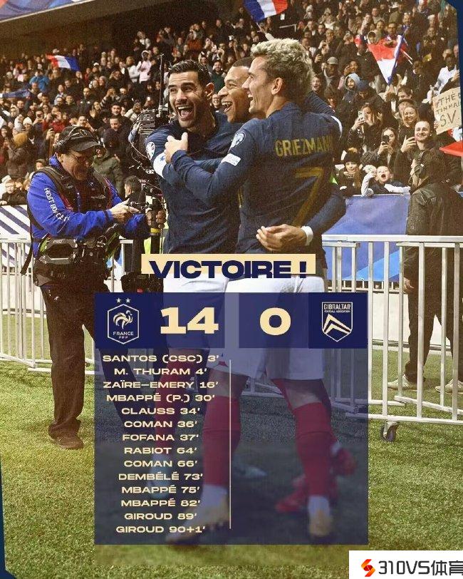 在11月19日,在法国队对阵直布罗陀队的欧洲杯预选赛竞赛中,高卢雄鸡在主场14-0疯狂的屠杀了对手,发明了预选赛历史上的极大差距的比分。应当说在这场竞赛中,法国队完全没有遇就任何的效果,也没有给对手太多的情面。从收场第3分钟就首开记载末尾,直到第91分钟、吉鲁完成第14个进球的,可谓是将直布罗陀打的基本就“爬不起来了”,全场竞赛贡献了39次射门、20次射正、73%的控球率的夸张数据,令对手无法。