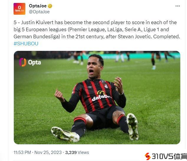 小克鲁伊维特在五大联赛均有破门,21世纪至今约维蒂奇后第二人