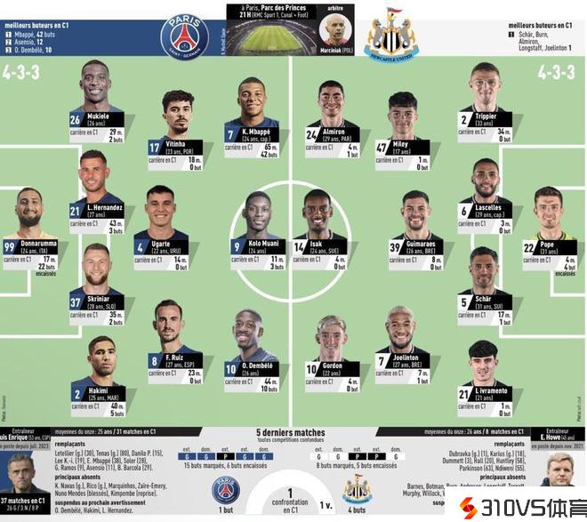 巴黎vs纽卡首发预测:登贝莱、穆阿尼、姆巴佩三叉戟