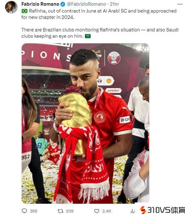 罗马诺:巴西俱乐部、沙特俱乐部关注中场拉菲尼亚的未来