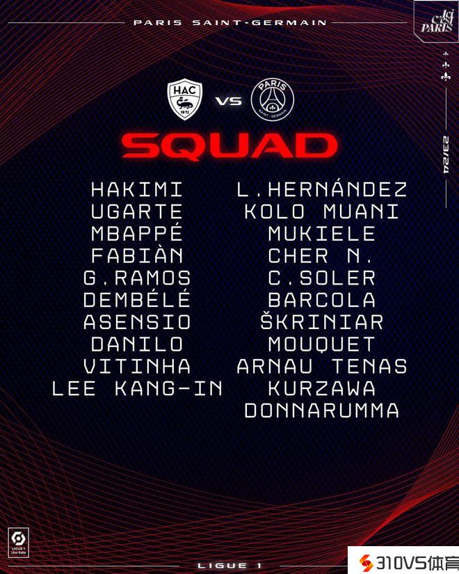 巴黎客战勒阿弗尔大名单:姆巴佩领衔,马尔基尼奥斯继续伤缺
