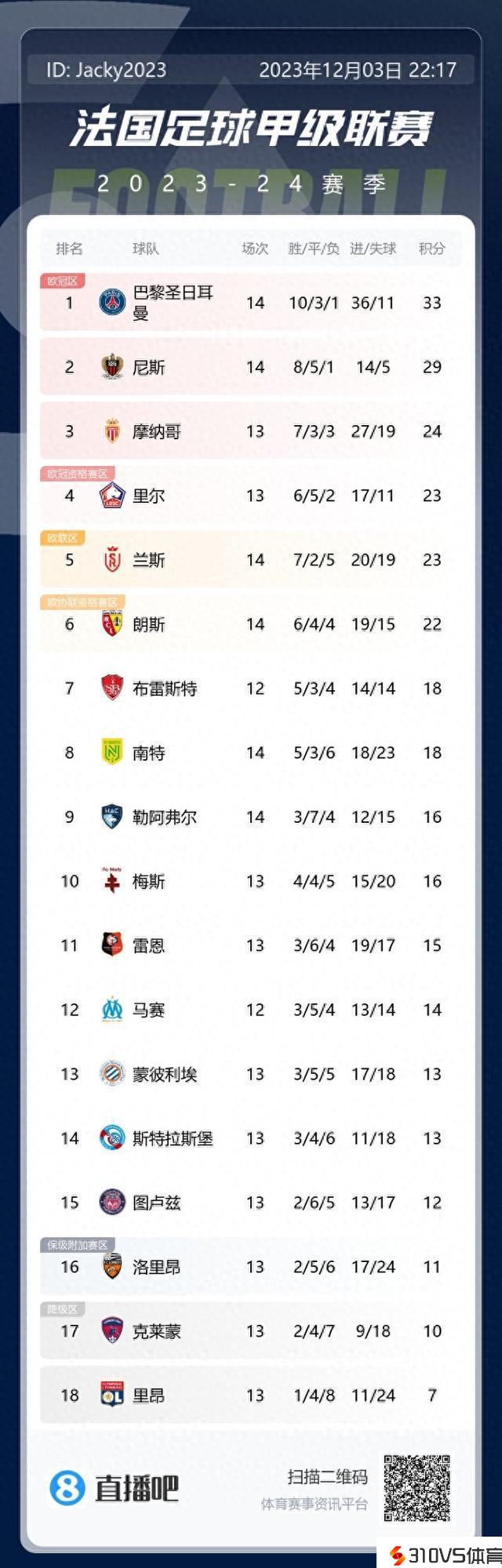 法甲积分榜:巴黎领跑优势扩展至4分,里昂1胜4平8负垫底