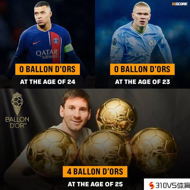 要努力了!姆巴佩24岁0金球,哈兰德23岁0金球,梅西25岁已4金球