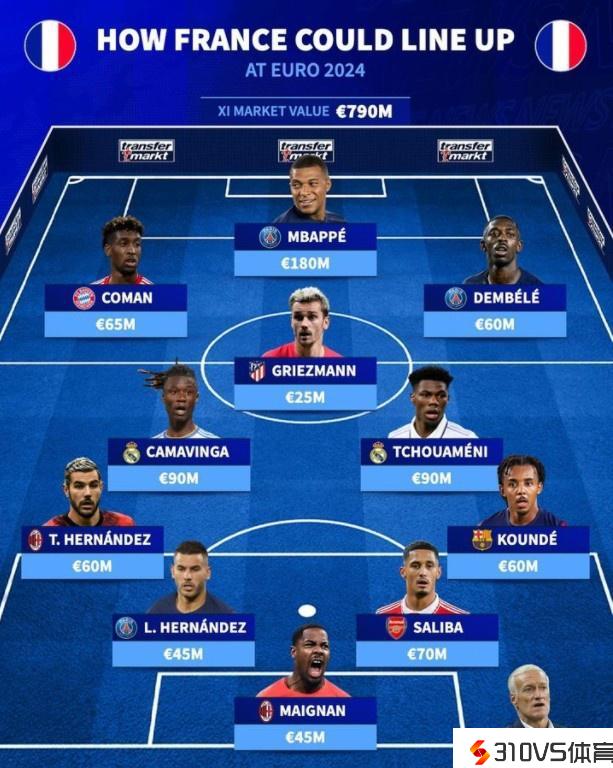 德转预测法国队欧洲杯首发:姆巴佩领衔巴黎3将,科曼萨利巴在列