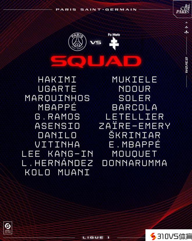 巴黎战梅斯大名单:姆巴佩兄弟、穆阿尼在列,登贝莱列席
