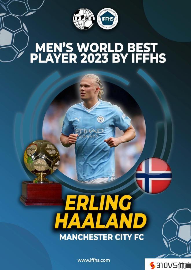 官方音讯,曼城前锋哈兰德中选国际足球历史与统计结合会(IFFHS)评选的2023年度最佳男足运发动。