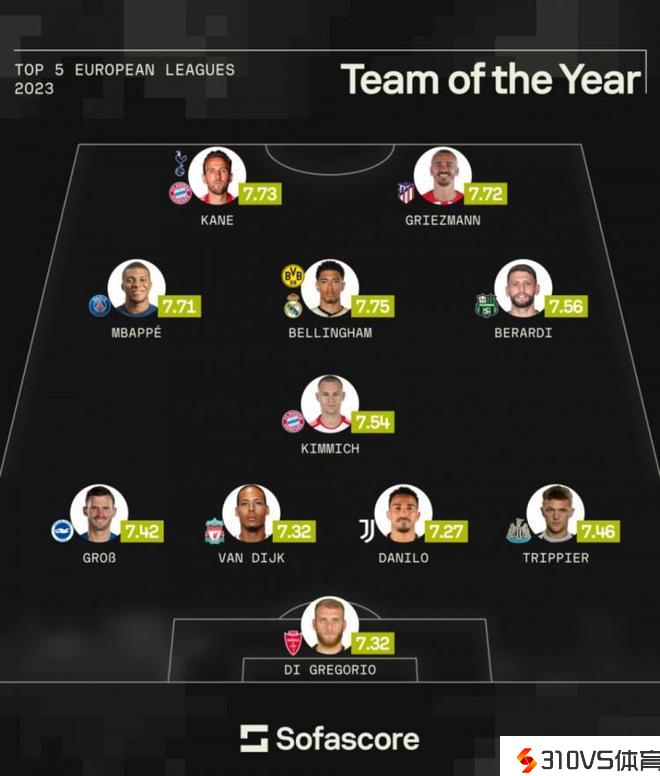 sofascore评五大联赛年度最佳阵:凯恩领衔,贝林厄姆&姆巴佩在列