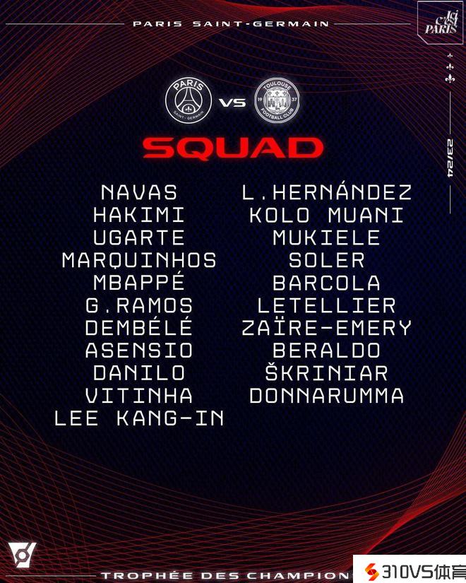 巴黎法超杯决赛名单:姆巴佩领衔,新援贝拉尔多在列