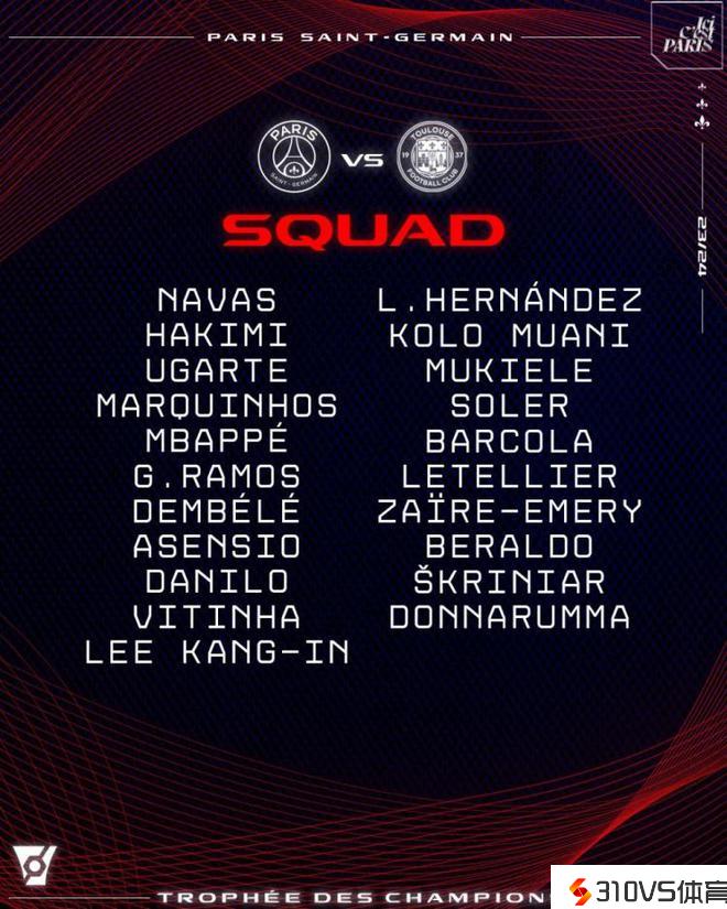 巴黎法超杯大名单:姆巴佩、登贝莱、穆阿尼、阿什拉夫在列