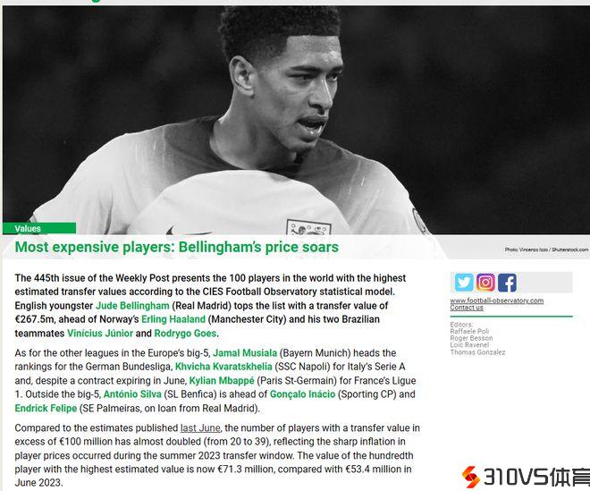 排名第一的球员,是大英帝星贝林厄姆。去年夏天,贝林厄姆以1亿欧元的价钱,加盟了西甲豪门皇马,开启了职业生涯的新篇章。原本大家以为,这位20岁的新星还需求一段时间顺应,才可以融入球队,没想到他却用举动通知了一切人,天赋并不是我等旁人可以揣度。半个赛季后,贝林厄姆交出了17粒进球和5次助攻的满分红绩单,他也以一名中场球员的身份,领跑西甲射手榜。《CIES足球天文台》以为,如今想要挖走贝林厄姆,转会费曾经飙升到了恐惧的2.67亿欧元!