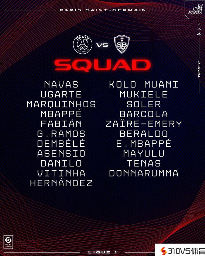 巴黎vs布雷斯特大名单:姆巴佩领衔,穆杰莱在列,什克仍列席