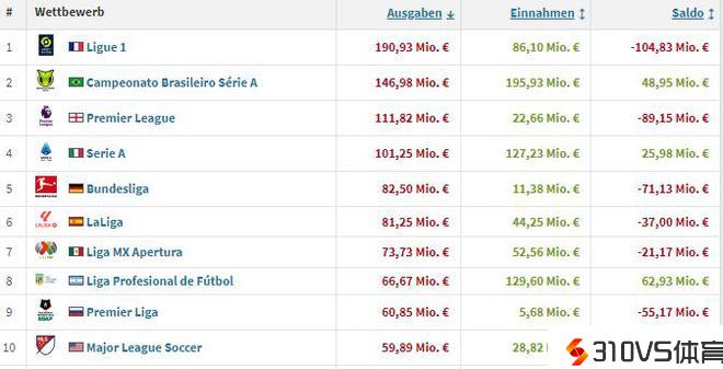 本赛季冬窗联赛支出排行:法甲1.9亿欧居首,巴甲第2&英超第3