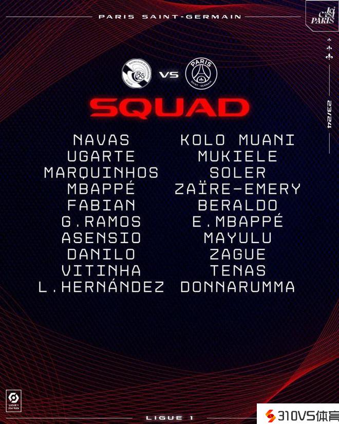 巴黎战斯特拉斯堡大名单:姆巴佩领衔,登贝莱未中选