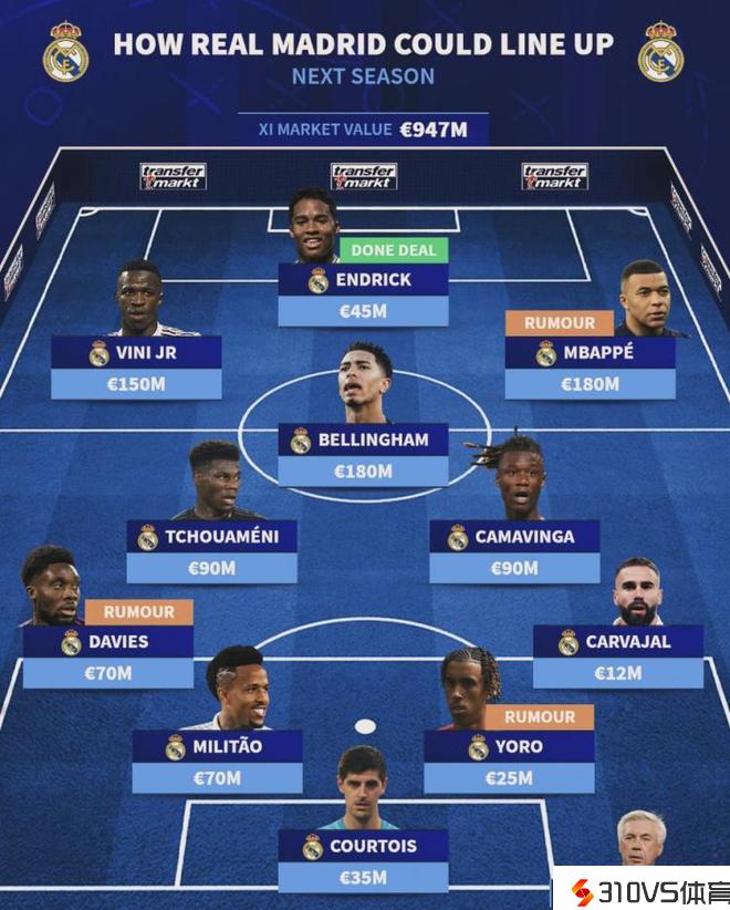 德转列皇马下赛季潜在首发11人:姆巴佩&贝林厄姆领衔