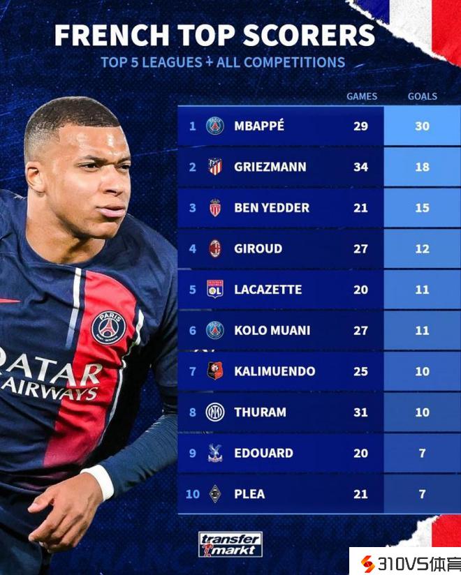 五大联赛法国球员射手榜:姆巴佩30球居首,格列兹曼18球次席