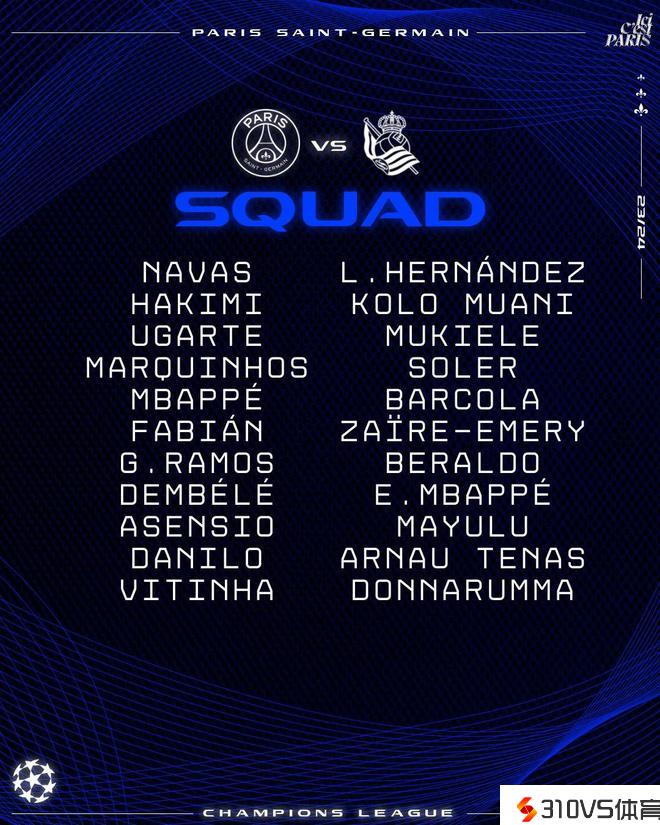 巴黎欧冠战皇社大名单:姆巴佩领衔,李刚仁列席
